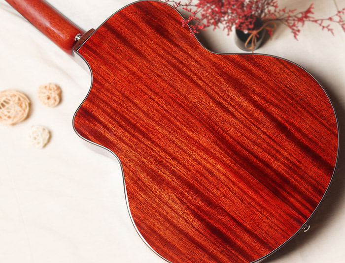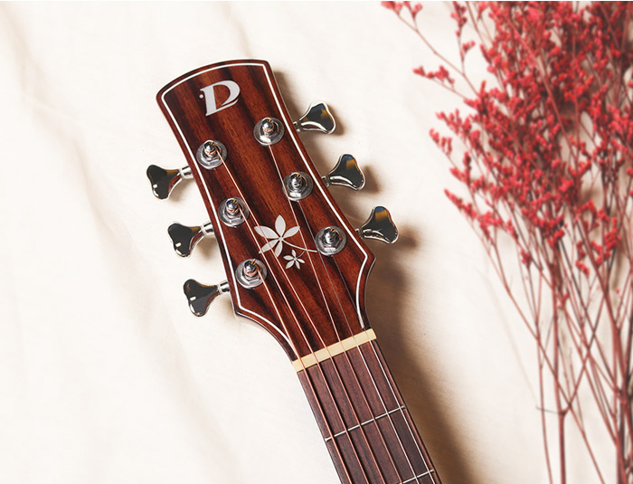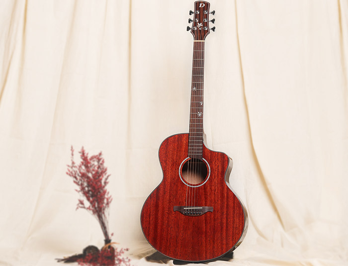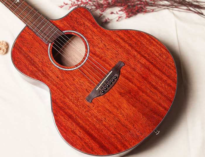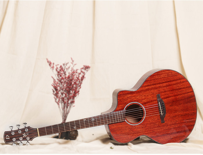 非洲全桃花芯,外观色泽亮丽,中低频出色,出众的音色和品质稳定性。琴体为亮光漆面,漆面通秀,油漆细节足以体现对品质苟刻外观漂亮。德国五拼琴颈,中间哑光向琴头,柄尾两端亮光过度,很大程度上保证了左手演奏的舒适性,轻松转换和弦。