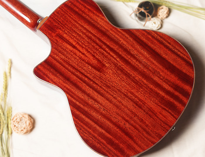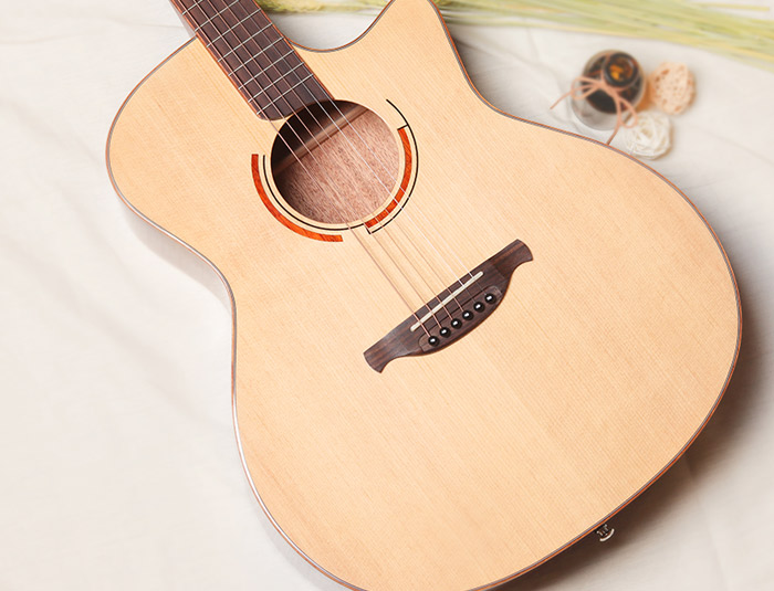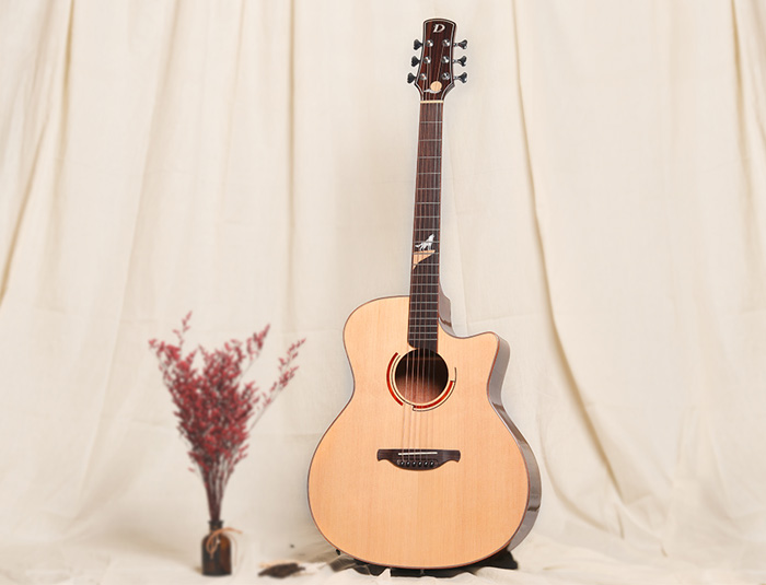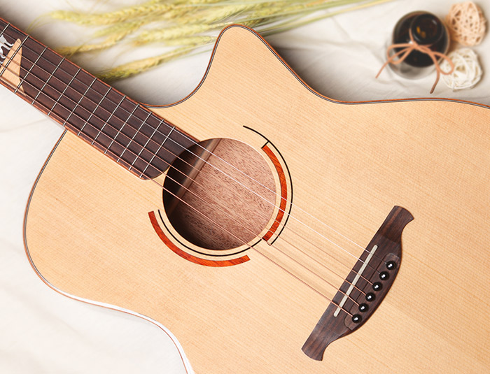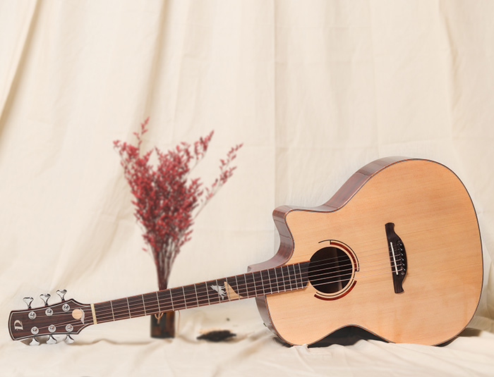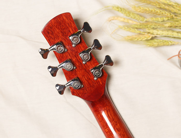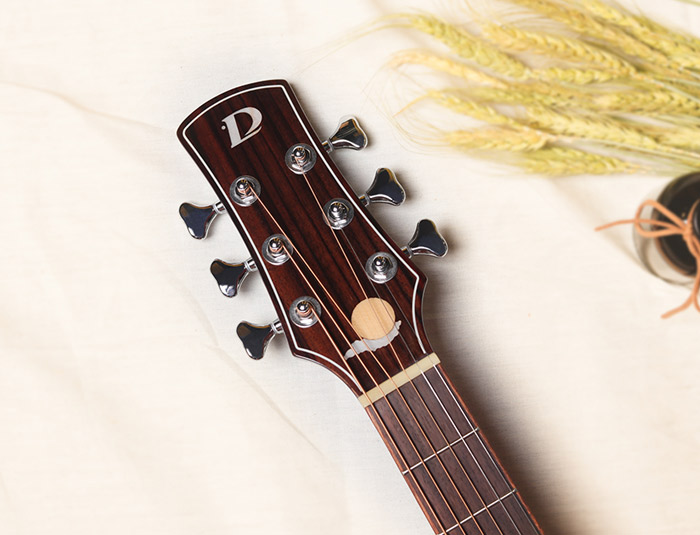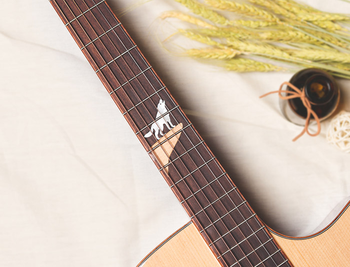 多米诺新系列GA-2,指板上带有特别精致的手工镶嵌设计:狼。在巧夺天工的工艺和精心细致的雕刻下,把悬崖上的狼仰天长啸雕刻的如此惟妙维肖,非常简洁大方时尚的口轮花设计,充满年轻时尚感。舒适的C形手感琴颈设计,带来更符合人体工程学的超低弦距手感体验。