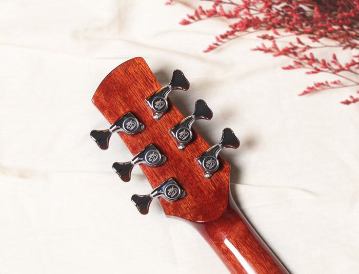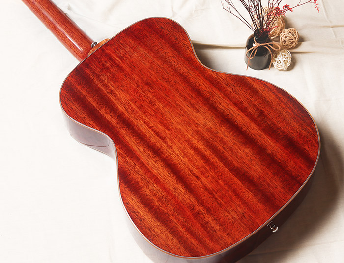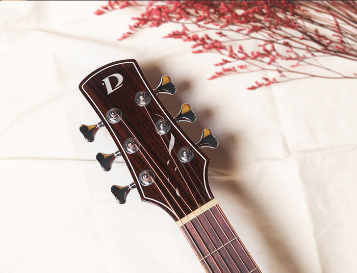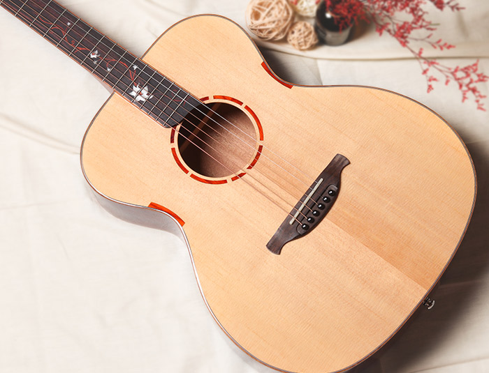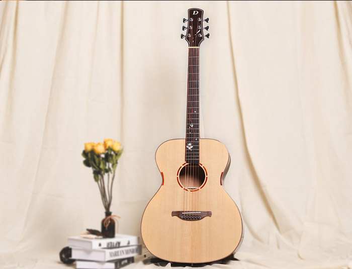 多米诺新系列OM-02,面板精选A级西提卡云杉单板,其显著的音色特点是:拥有出色的共鸣,声音柔和明亮,敏感度高,不需要多大的指力,便可弹出洪亮的声音,琴体采用亮光漆面,使木材得到更好的保护。指板上带有精致手工镶嵌的牡丹花设计,与结合简洁大方的口轮花设计,低调而不平凡,在一片朴实无华中彰显着这款吉他的独特气质。