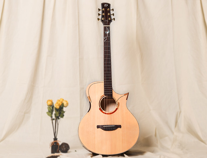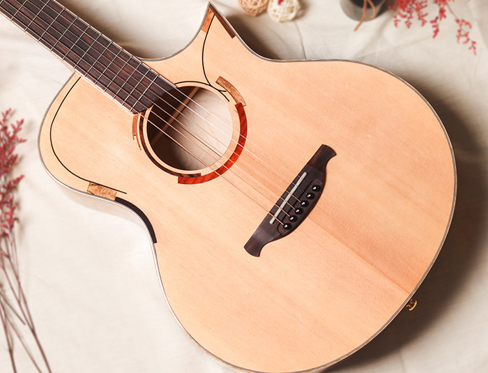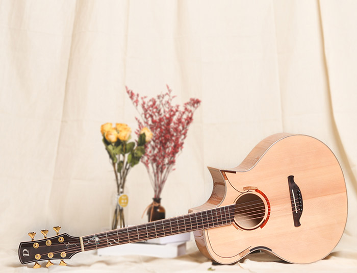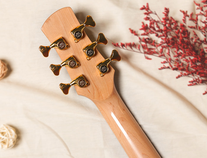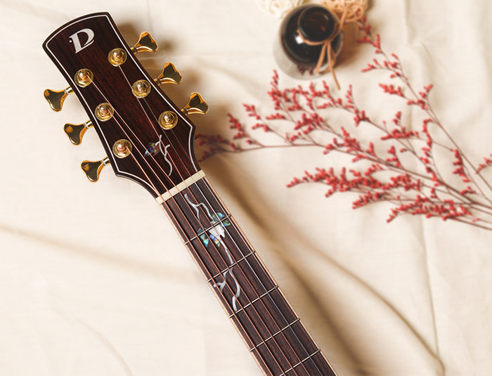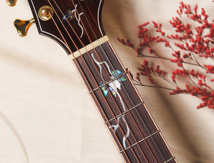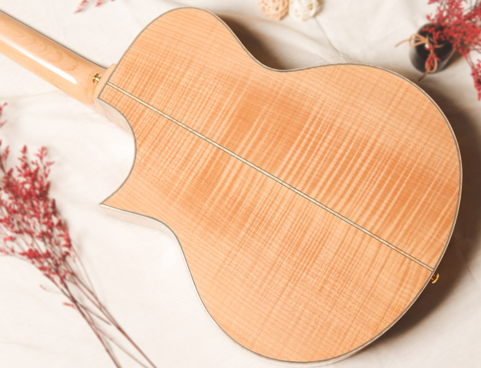面板上、口轮花与尖角部位,有着非常简洁时尚的枫木镶嵌设计,充满年轻时尚感,同时指板和琴头衔接处有着精选高级彩贝镶嵌的蔓藤设计。背侧板精选虎纹枫木木材,木纹明显特别,音色侧重均衡的清晰感和共鸣的力量感,声学、美感、人性合而为一。